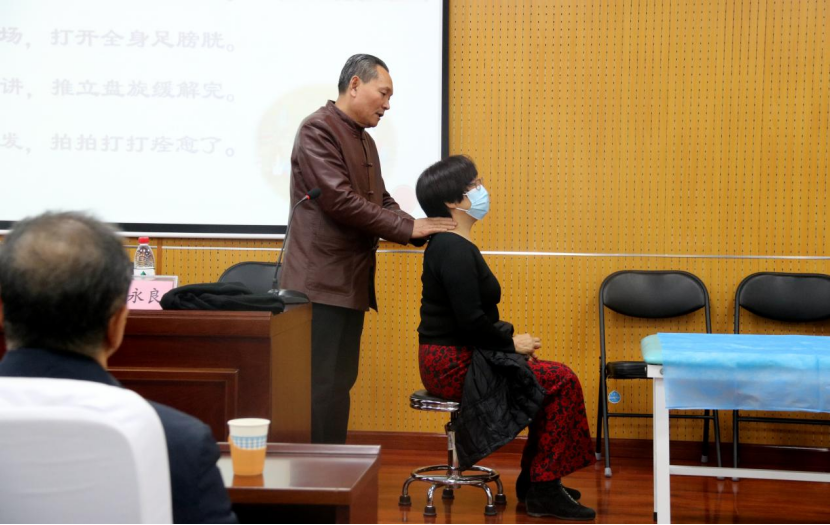 在第一学术报告厅刘永良教授为谈球吧师生作了一场题为《刘氏九宫点穴正脊经筋疗法》的学术报告。刘教授主要从中医急救、常见疾病简易治疗经验和九宫点穴正脊经筋疗法三部分进行分享。刘教授讲课生动活泼,干货满满,并润物细无声的融入了课程思政的内容,老师与同学们积极录像、做笔记,收获颇丰。在实际操作的现场演示环节,刘永良教授主要讲解了颈椎病、肩周炎、落枕和关节脱位等日常生活中常见疾病的治疗手法,引导员工实践运用。讲座结束时师生仍意犹未尽,热情提问请教,作为公司客座教授,期待刘永良教授今后为师生带来更多精彩讲座和专业指导!