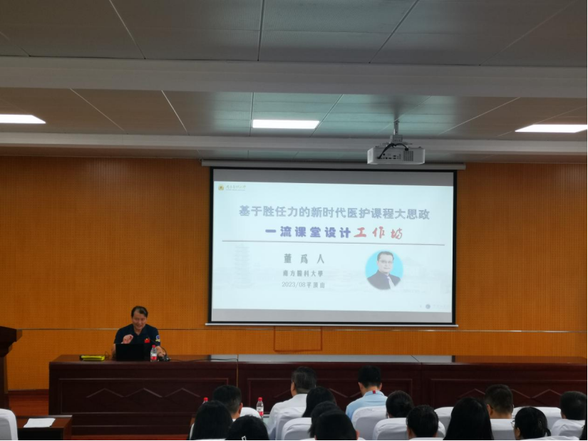 8月17日上午,董教授为老师们做了《基于胜任力的新时代医护课程大思政一流课堂及其设计》的主题培训。董教授指出,一流课程是人才培养的最后1.0公里,而课堂是育人的主战场、主阵地、主渠道,一流课堂是人才培养的最后0.1公里。他从新时代百年未有之大变局开篇新时代&课程思政,结合医护岗位胜任力提出一流课堂设计要有醒目的开篇,要有富有内涵的内容,要有点睛的结尾。董教授强调,医学教育应着重培养员工的创新发散思维和质疑精神、以及临床思维能力,教学有法,贵在得法,在教学过程中如何培养创新人才?董教授结合自己的研究,运用大量实例,详细的分享了医护专业如何在课堂的开篇、内容、结尾、教法、考评、小结等方面进行设计,切实培养医员工的岗位胜任力,教学中的思政教育应是“润物细无声”,要巧妙融入新时代的课程思政元素。4个小时的报告老师们都聚精会神,董教授幽默又干货满满的讲解让大家知道了如何丰满自己的课堂,如何将思政元素润物细无声融入课堂教学中。