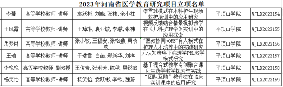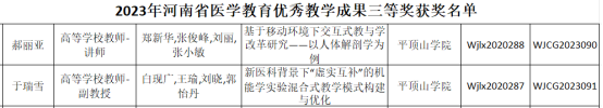近日,河南省卫生健康委员会下发了《河南省卫生健康委关于公布2023年河南省医学教育研究项目立项教学成果和优质课评选结果的通知》(豫卫科教函〔2023〕41号),此次公司获批医学教育研究项目立项6项,结项13项;获评河南省医学教育优秀教学成果二等奖3项,三等奖2项;获评医学教育优质课教学二等奖1项。