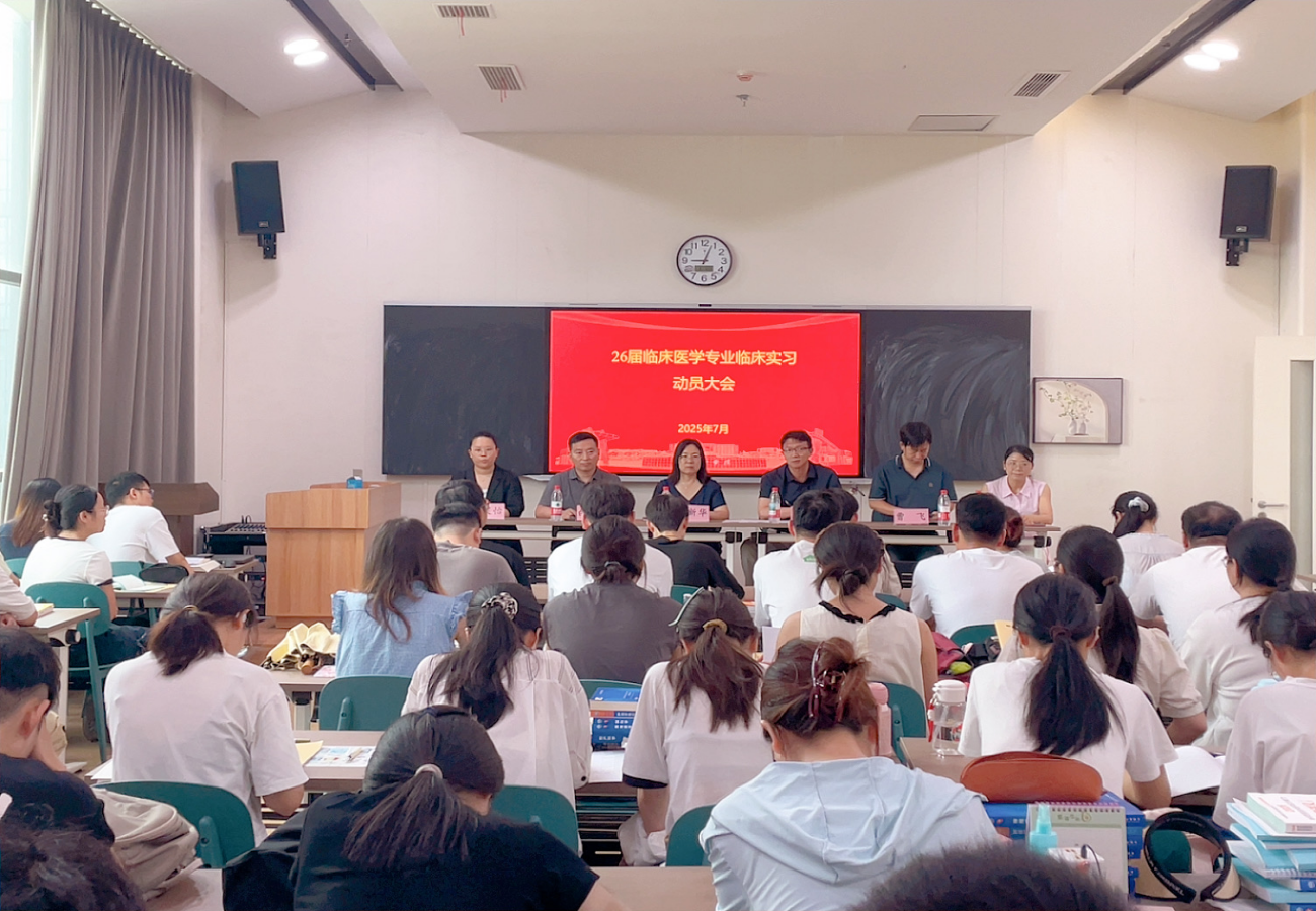 2025年7月1日,公司2026届临床医学专业临床实习动员会在第一附属医院会议中心第三教室召开。第一附属医院副经理刘宏、科教科主任曹飞,谈球吧副经理白现广、实习办主任刘丽、临床医学系主任杨笑怡,全体实习指导老师及实习生出席会议,谈球吧经理郑新华主持会议。