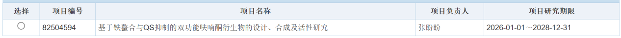 2025年8月27日,国家自然科学基金委员会公布本年度立项结果,公司张盼盼博士主持的《基于铁螯合与QS抑制的双功能呋喃酮衍生物的设计、合成及活性研究》项目获批青年科学基金,获资助30万元。这是公司国家级基础研究项目又一重要突破,充分展现了公司青年科研人员的创新活力与学术潜力。