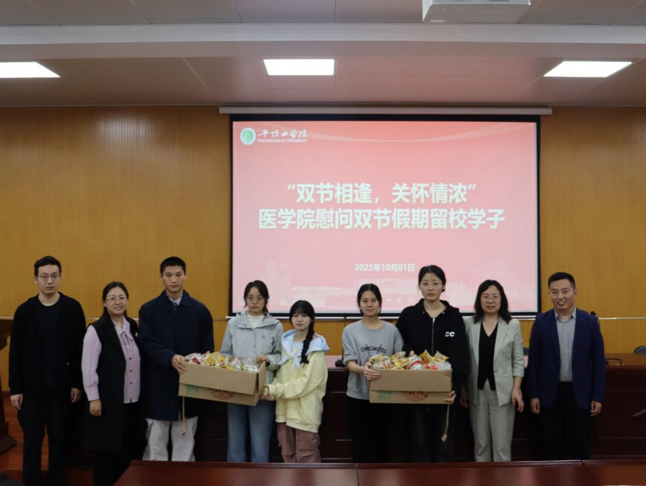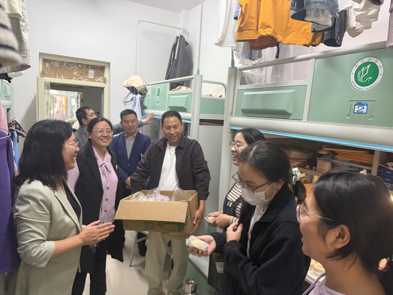 最后,学院领导班子前往湖滨校区,走进21、22级临床专业员工的宿舍分发月饼,详细了解同学们的留校生活与实际情况,并对宿舍安全状况进行了全面排查,确保大家能度过一个平安、祥和的假期。
