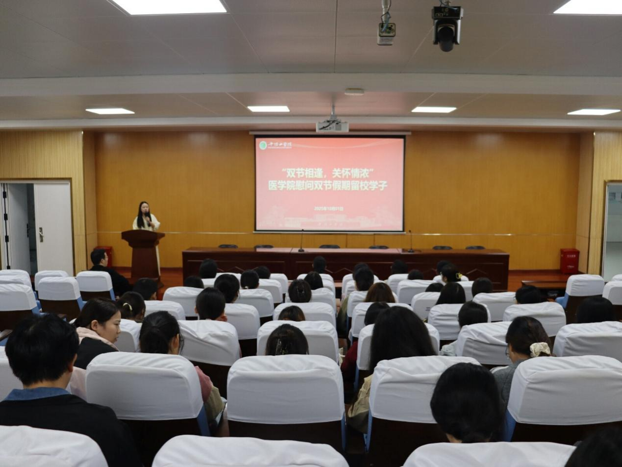 上午,谈球吧在崇文校区1、2号学术报告厅进行留校员工慰问座谈会及观影活动。公司党委书记王莉、经理郑新华、党委副书记夏乐、副经理高华山、副经理白现广,教师代表,及两百多名留校员工共同出席。1号学术报告厅里,针对留校备战考研的同学们,药学系张盼盼老师就考前复习策略、心理压力调整、应试技巧等方面进行指导,帮助同学们明确方向、稳定心态,以最佳状态迎接考试。随后,郑新华代表学院向同学们致以节日的问候,对同学们勤奋学习、刻苦钻研的精神表示肯定,并叮嘱同学们合理安排假期时间,夯实专业基础,成长为卓越医学人才。王莉叮嘱同学们在假期要注意人身与财产安全,学习的同时也要加强身心锻炼,拥有一个良好的体魄去迎接接下来的学习生活。2号学术报告厅中,夏乐强调了假期安全与员工未来职业规划,鼓励同学们多接触校园以外的生活,高华山则鼓励同学们在大学期间应主动走出校园,去感知广阔的世界,增长见识,全方位提升自己。活动后,学院向同学们分发月饼,送去节日的祝福。