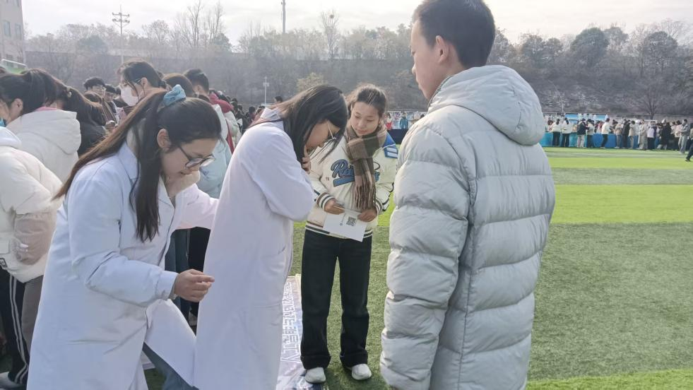 实操环节中,百余位师生在模拟人上进行练习。团队采用“手把手指导+实时反馈”实操模式,对按压姿势、节奏等关键环节进行逐一指导纠正。同学表示,急救实践不仅需要体力与专注,更让他们深刻体会到医学的严谨与守护生命的责任。