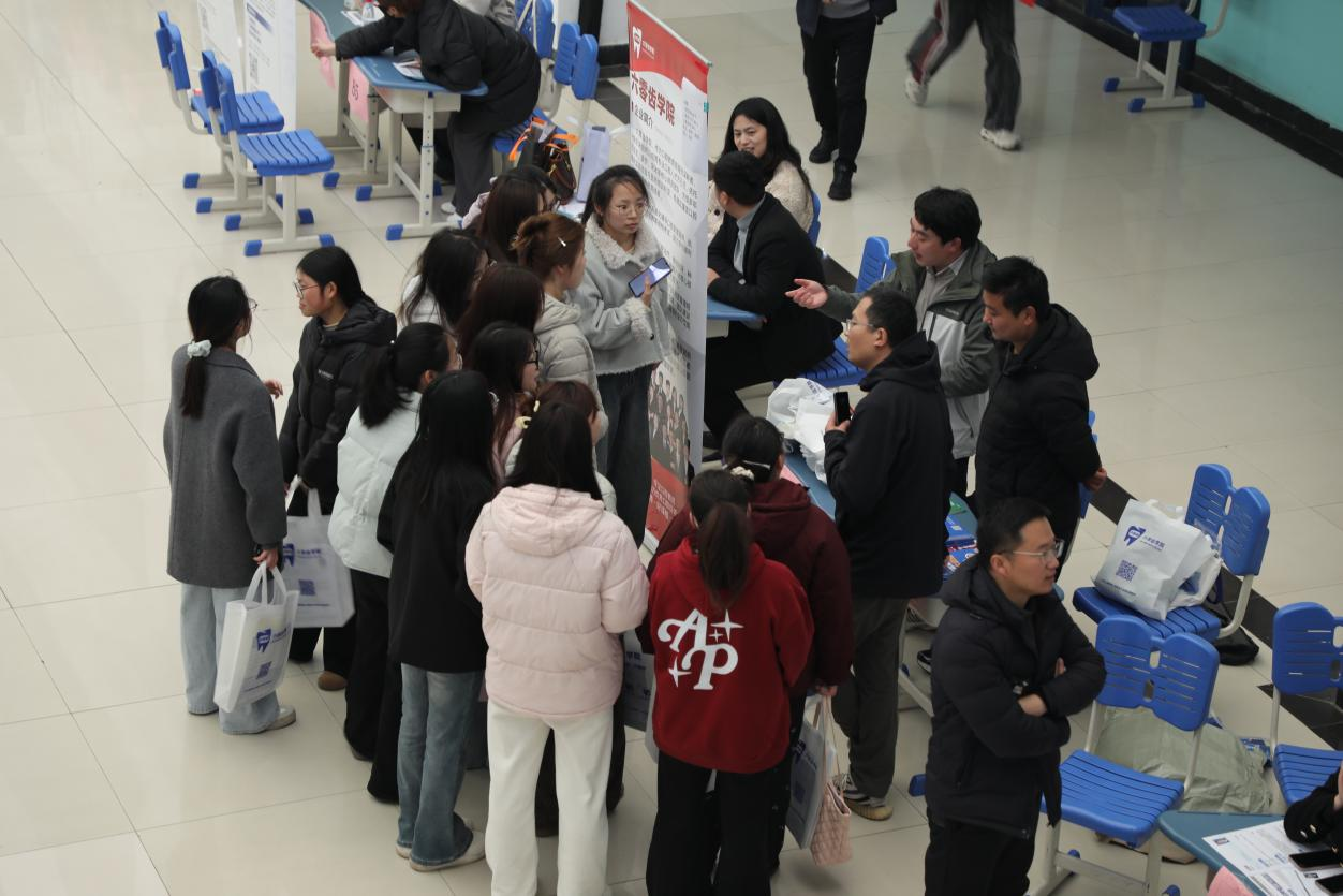3月19日下午,谈球吧体育“豫荐未来 青春启航”2026届毕业生医药类春季就业双选会在崇文校区教学楼大厅成功举办。本次招聘会由学校人才招聘处主办,谈球吧承办,公司党委副书记侯延民到场指导,人才招聘处、谈球吧负责同志、实习办、辅导员和2026届500余名毕业生参与了此次招聘活动。